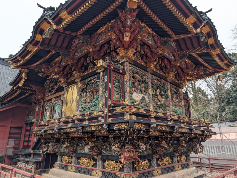 外壁を覆う彫刻群は物語性に富み、唐獅子や龍、牡丹、鳳凰などが躍動感あふれる姿で刻まれています。平成15年から8年に及ぶ大修理により創建当時の鮮やかな色彩が蘇り、光の角度によって表情が変わります。